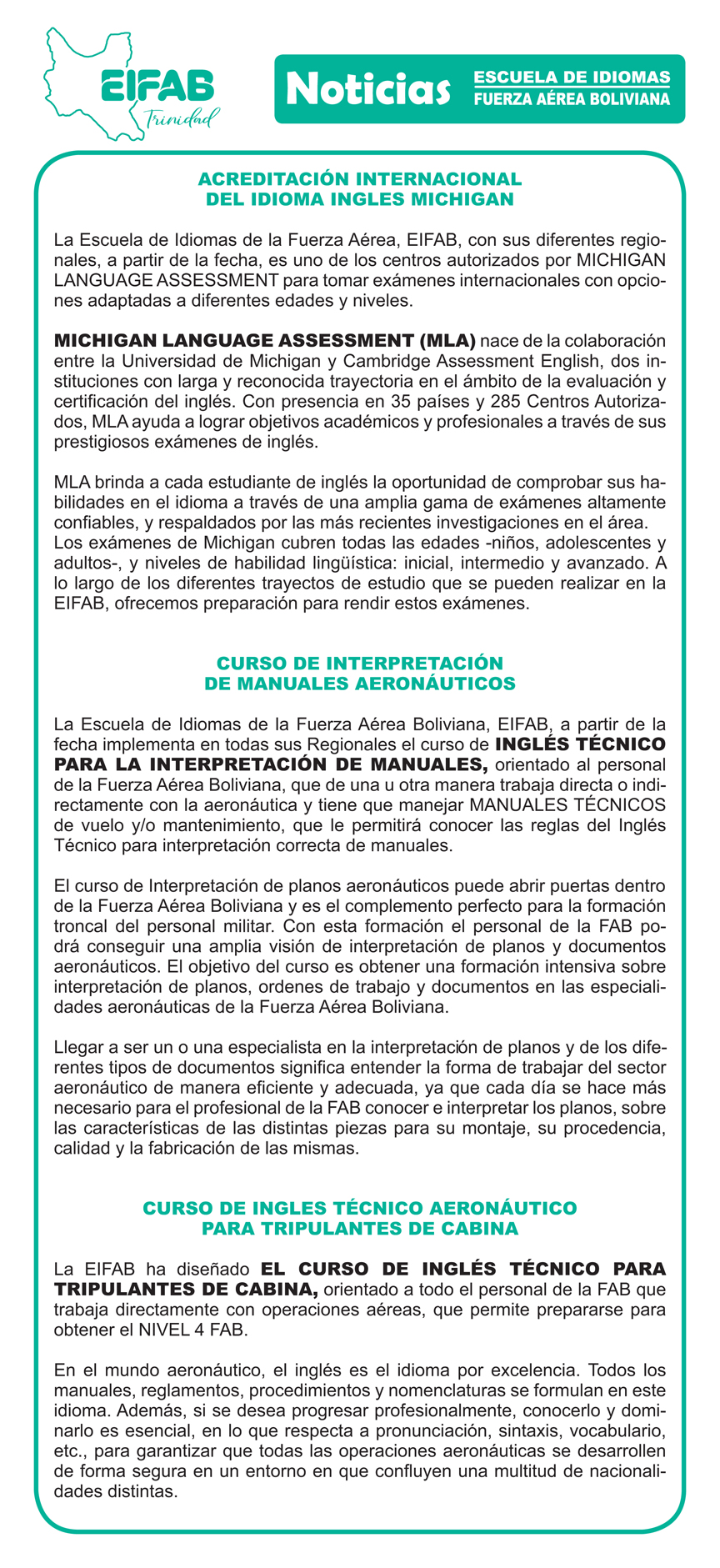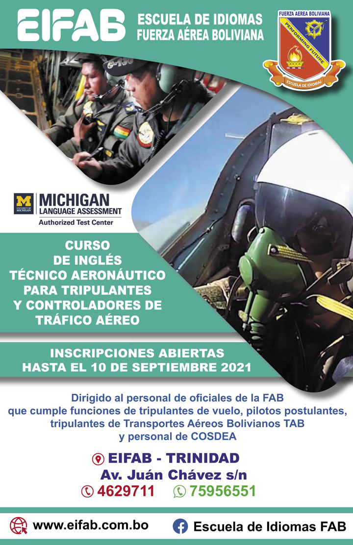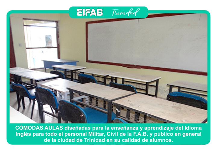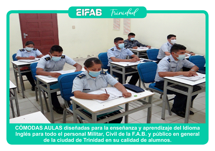 A lo largo de su trayectoria, la EIFAB Trinidad, ha sido reconocida como uno de los mejores institutos de enseñanza del idioma inglés, manteniendo el buen prestigio e imagen de la Fuerza Aérea Boliviana, asimismo, la EIFAB Trinidad ha graduado a varias Promociones en el Curso de Inglés General e Inglés Avanzado.