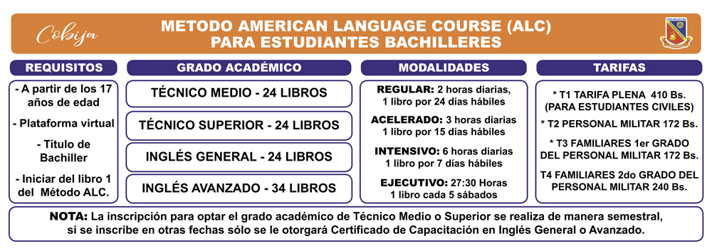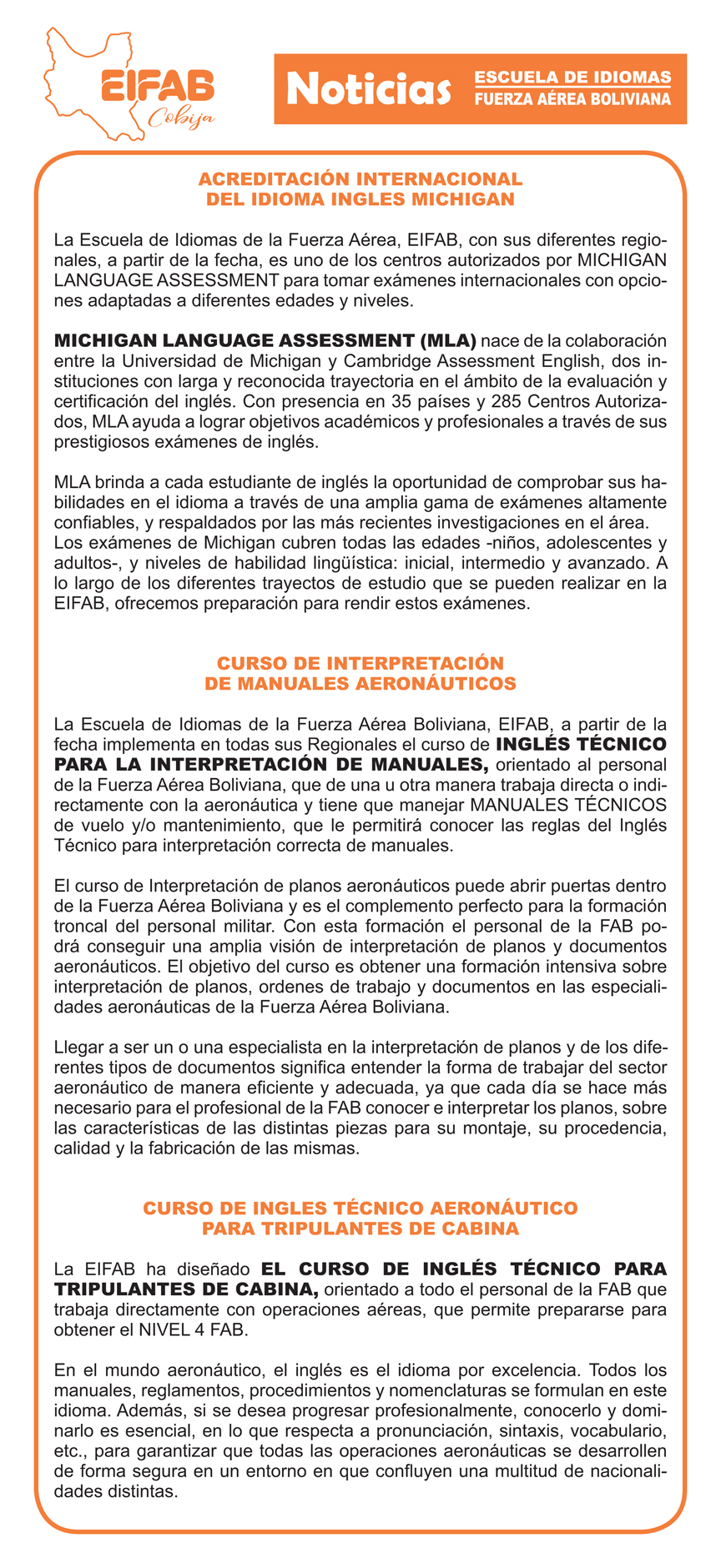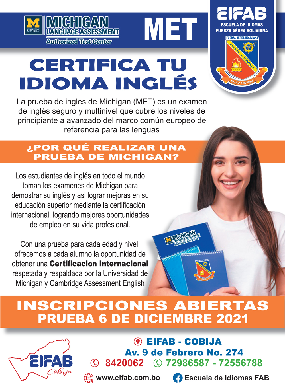 Actualmente la EIFAB Regional Cobija se encuentra en un periodo de trámites para poder brindar a sus estudiantes la posibilidad de obtener la certificación como técnicos medios y superiores en inglés.
