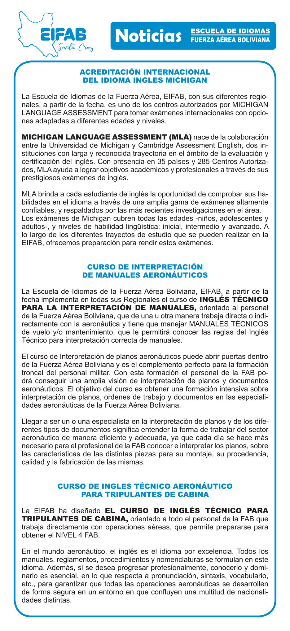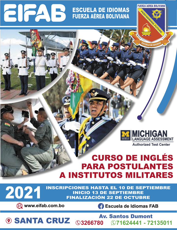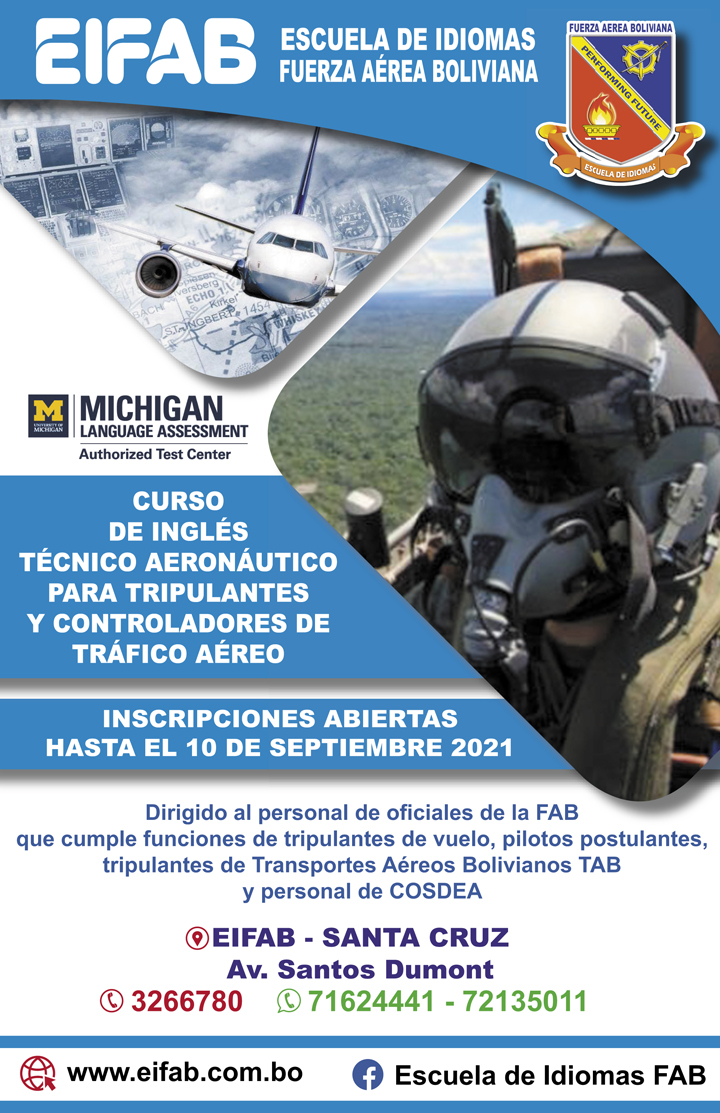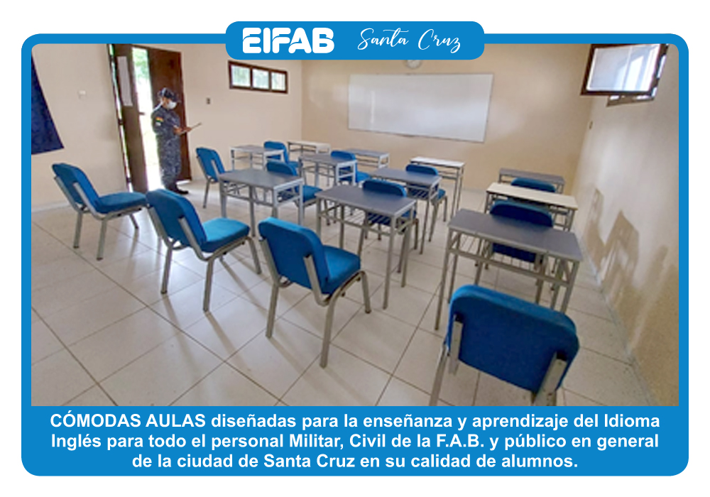 El Departamento V-EMGFAB previo estudio y planificación bajo la dependencia del Comando General de la FAB, dio por misión a la EIFAB “Impartir la enseñanza de Idiomas de Ingles como segunda lengua y otros que requieren a la institución, permitiendo a su Personal Militar, Administrativo de la FAB, familiares y población civil, a fin de satisfacer los requerimiento institucionales de la población”.