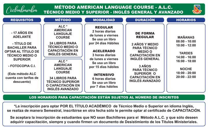 La Escuela de Idiomas de la Fuerza Aérea Boliviana, a través del método ALC (American Language Course) que consta de 34 libros distribuidos en seis niveles, prepara a los estudiantes a expandir el conocimiento para que se desenvuelvan eficientemente en entornos académicos, profesionales y sociales.