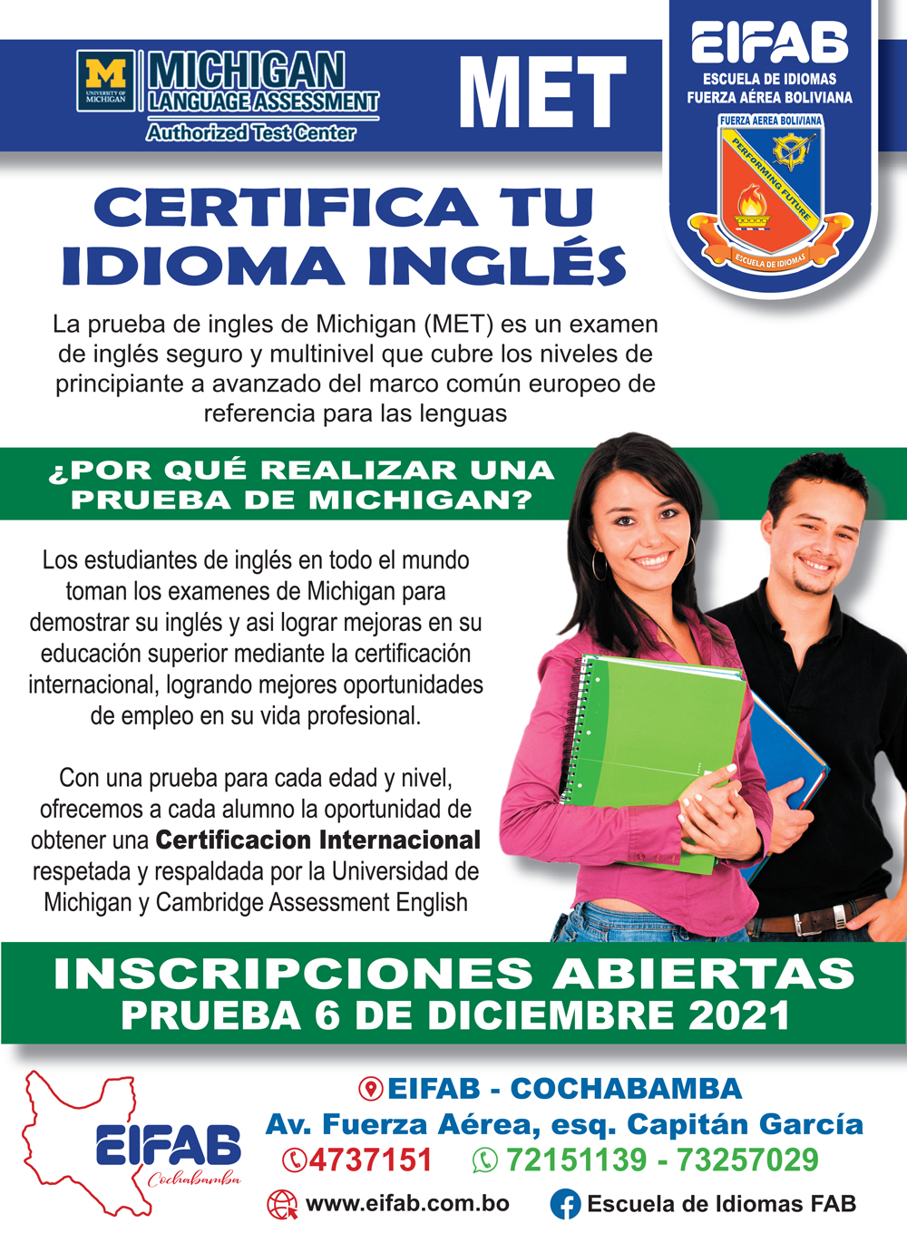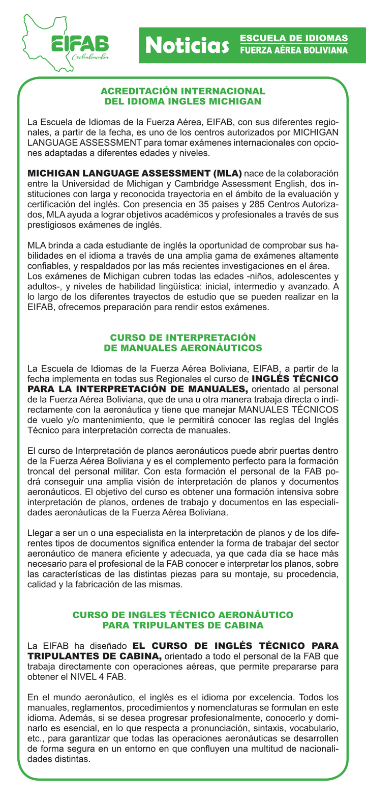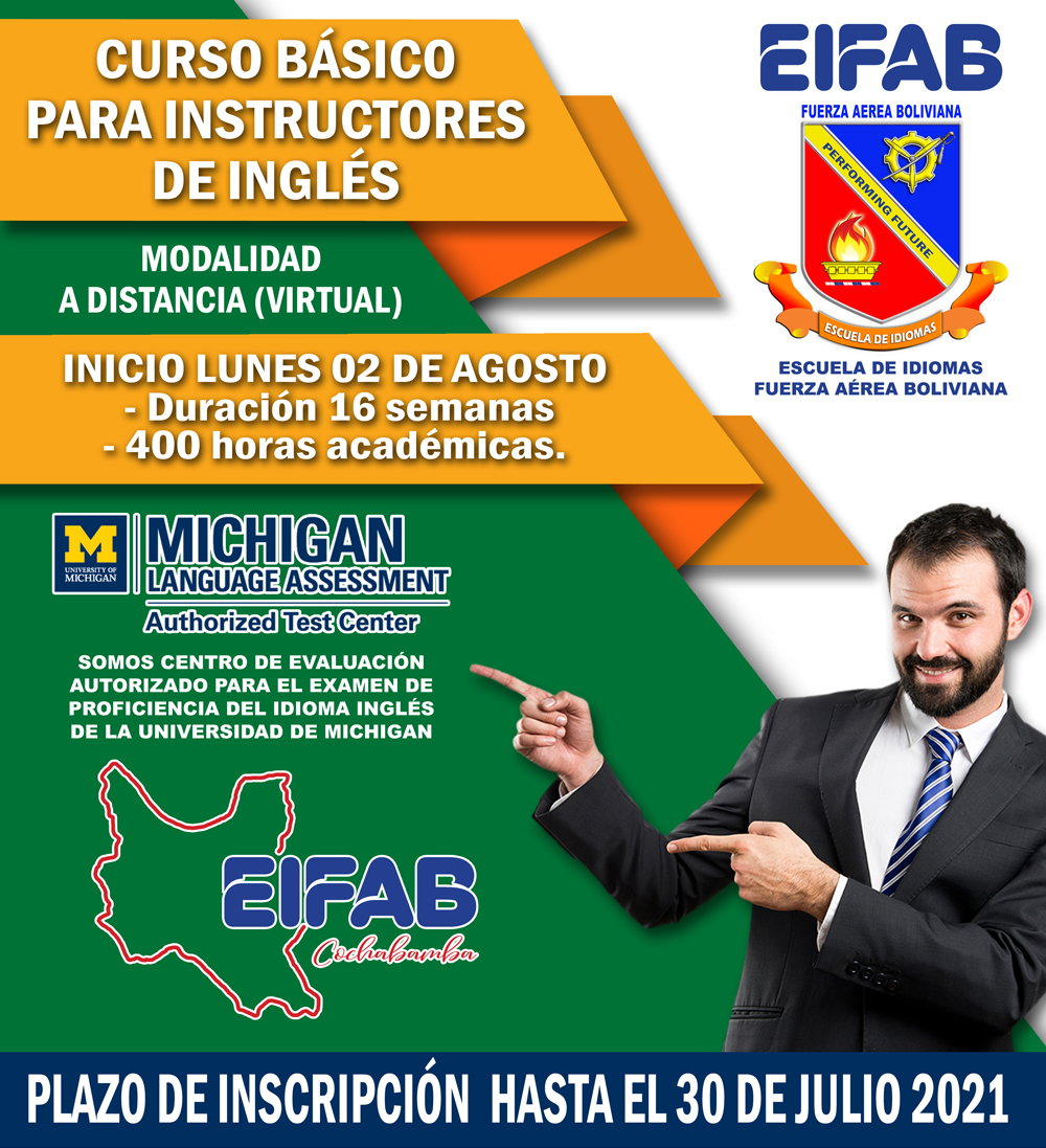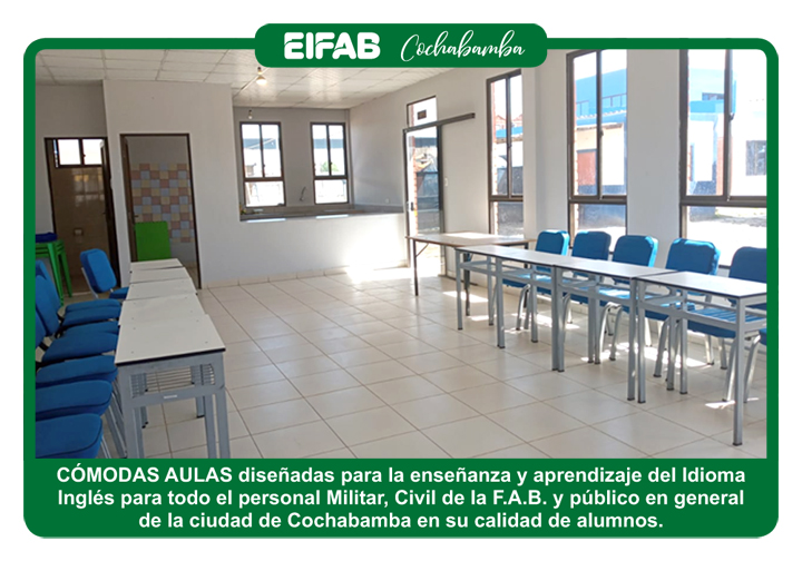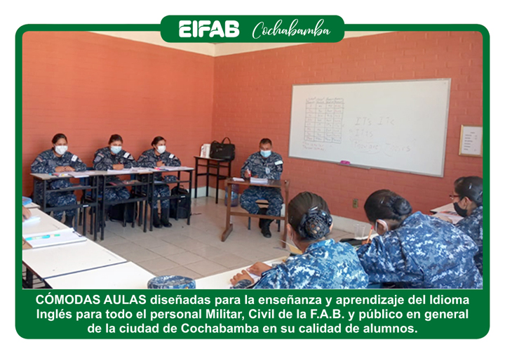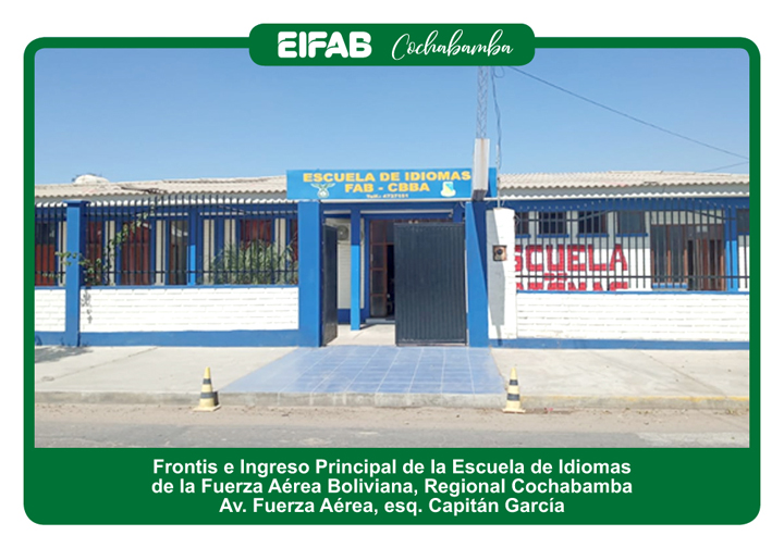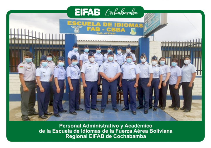 La EIFAB Regional Cochabamba cumple satisfactoriamente las tareas asignadas a esta repartición por la Dirección General EIFAB, capacitando tanto al personal Militar, Civil de la F.A.B. y población en general, en los diferentes Idiomas ofertados, lo cual ha ido incrementado la demanda en cada gestión académica demostrando profesionalismo y disciplina el cual es la piedra angular de nuestra institución.